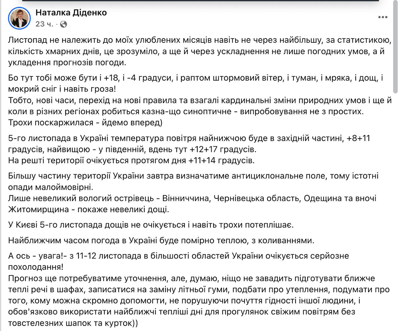 "В ближайшее время погода в Украине будет умеренно теплой с колебаниями. А вот – внимание! – с 11-12 ноября в большинстве областей Украины ожидается серьезное похолодание! Прогноз еще потребует уточнения, но, думаю, ничто не помешает подготовить поближе теплые вещи в шкафах, записаться на замену летней резины, позаботиться об утеплении, подумать о том, кому можно скромно помочь, не нарушая чувство достоинства другого человека, и обязательно использовать ближайшие теплые дни для прогулок", - пишет синоптик.