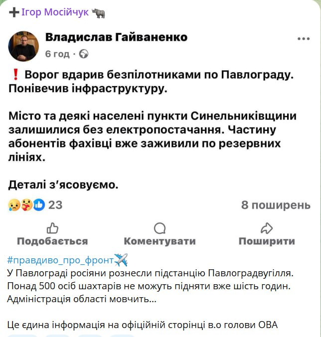 "В Павлограде россияне разнесли подстанцию ​​Павлоградугля. Более 500 человек шахтеров не могут поднять уже шесть часов. Администрация области молчит...", - говорится в сообщении.