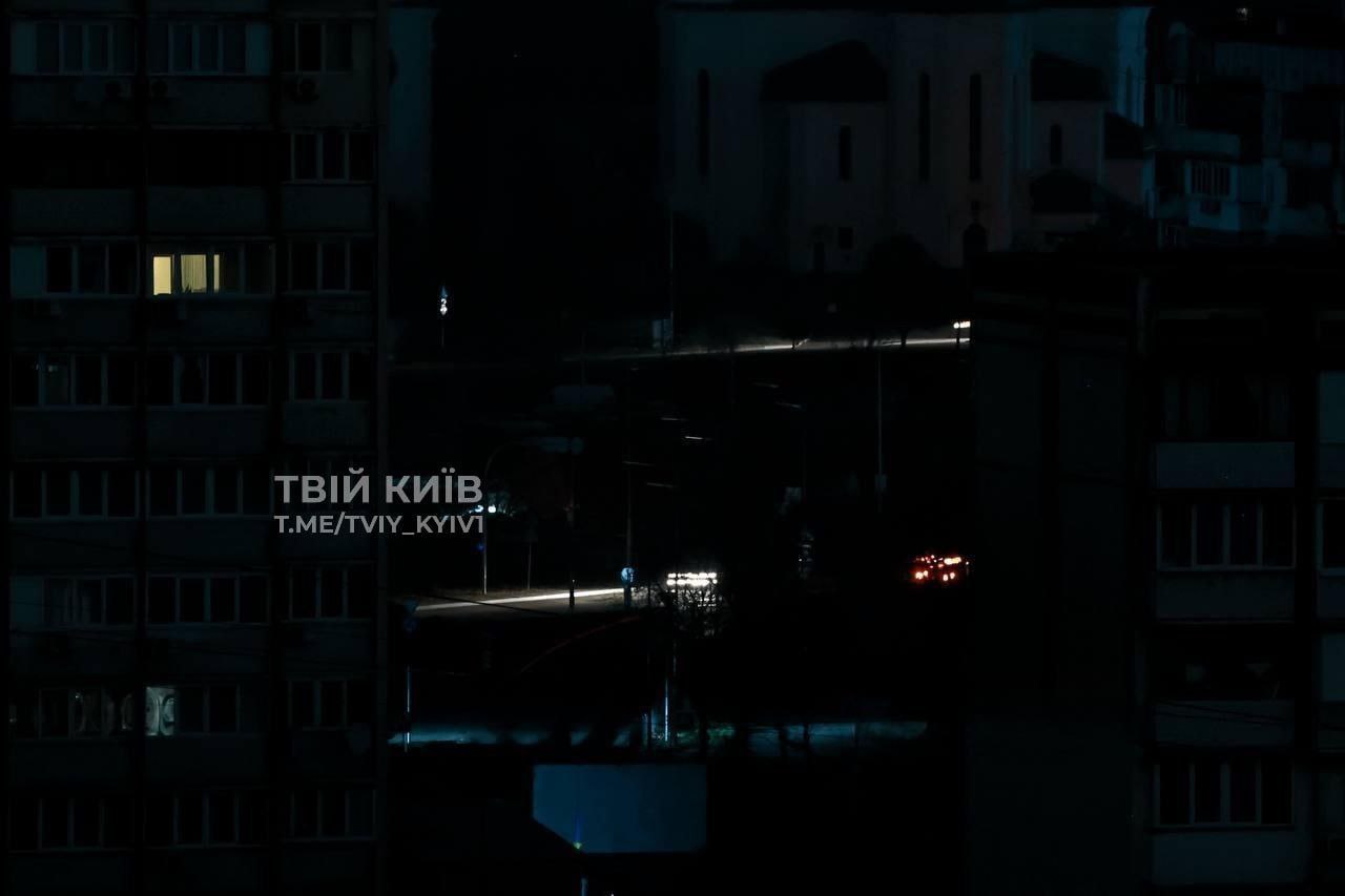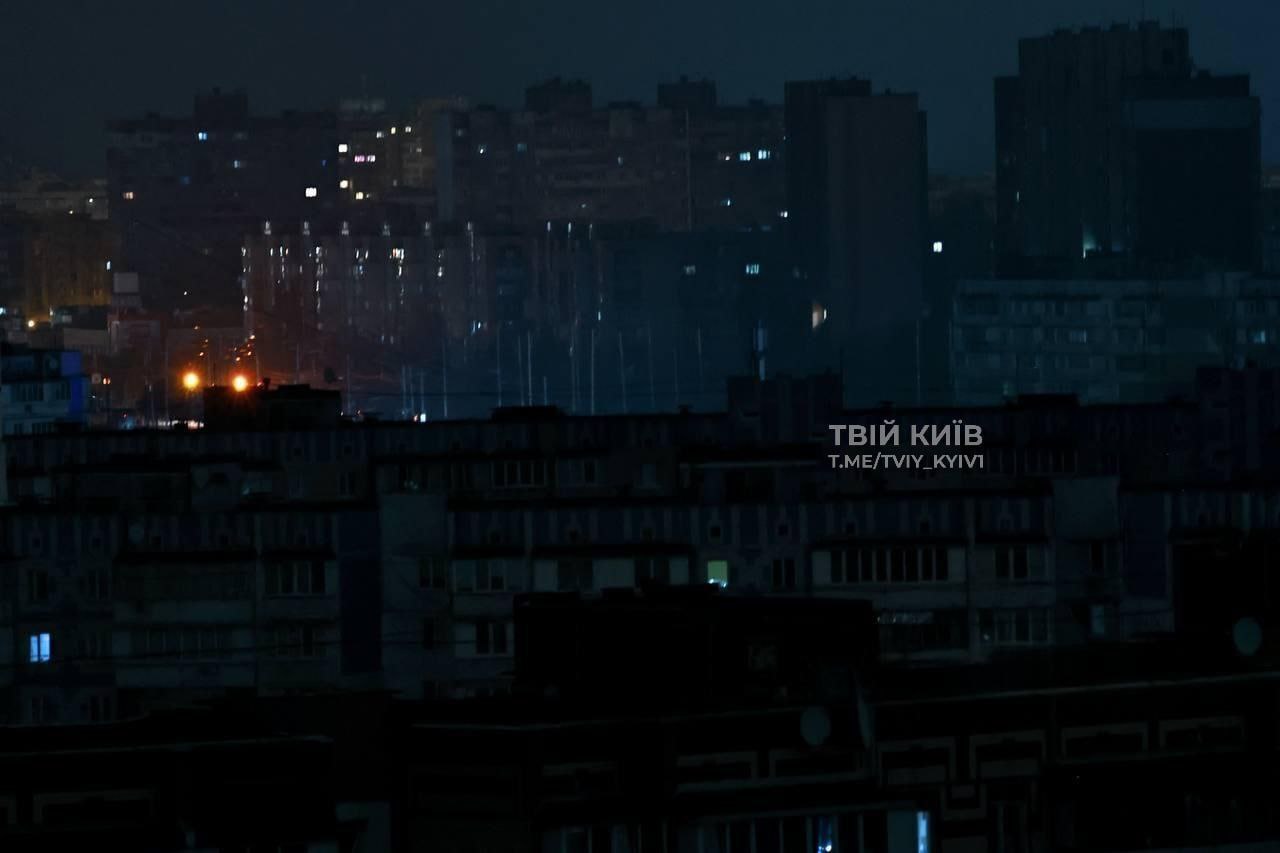 22:56 Ещё кадры с киевской Троещины, где из-за ночных ударов идут отключения света.