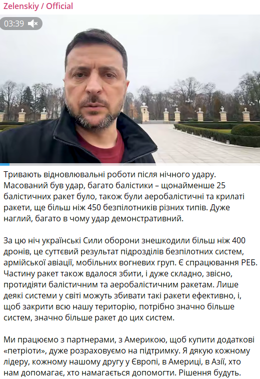 "Массированный был удар, много баллистики - не менее 25 баллистических ракет было, также были аэробаллистические и крылатые ракеты, еще более 450 беспилотников различных типов", - заявил глава государства.