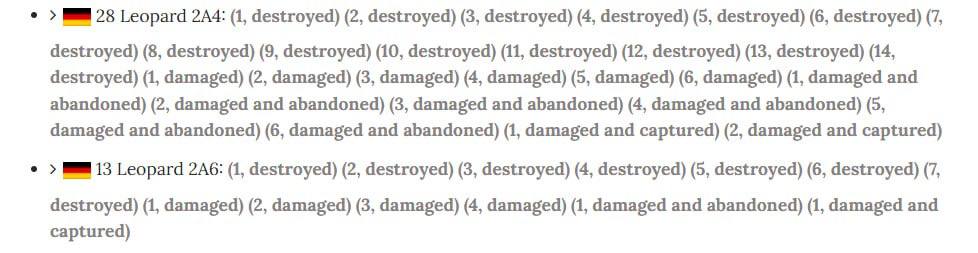 Отметим, что всего на вооружении ВСУ на пике находился 81 танк Leopard 2, часть из этой партии уже повреждена или уничтожена. По данным портала Oryx, визуально подтверждена потеря Украиной 42-х машин (см. скрин).