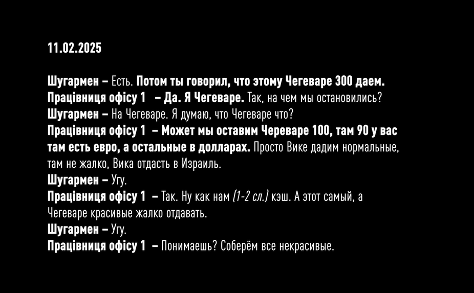 Шугармен: Мы, по идее, должны дать *** (вице-премьер-министру – прим.) там 300 тысяч. Я просто не хочу давать красивые. Хочу, если появятся, некрасивые.