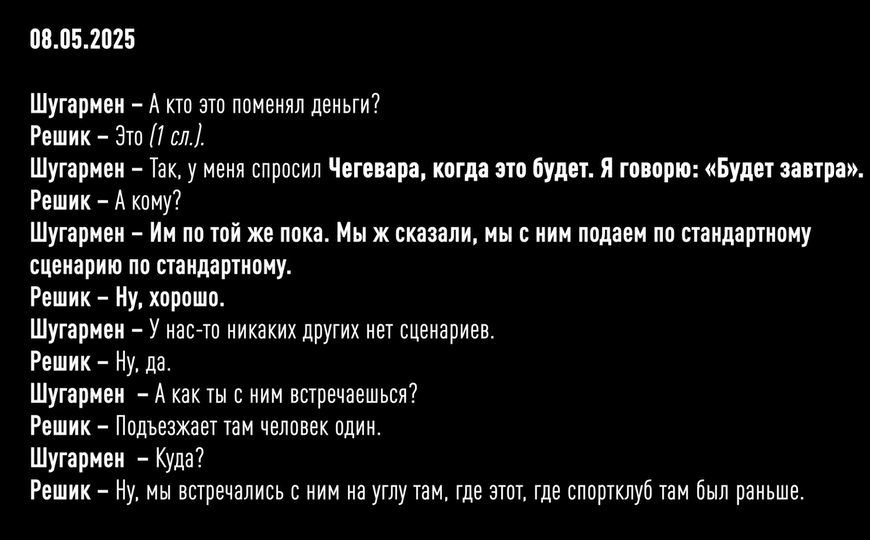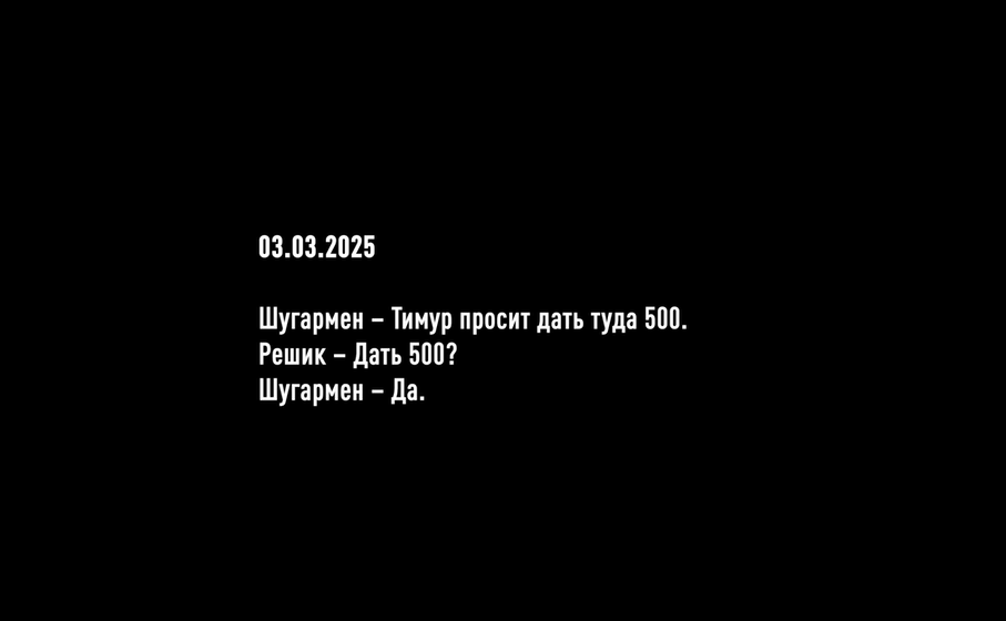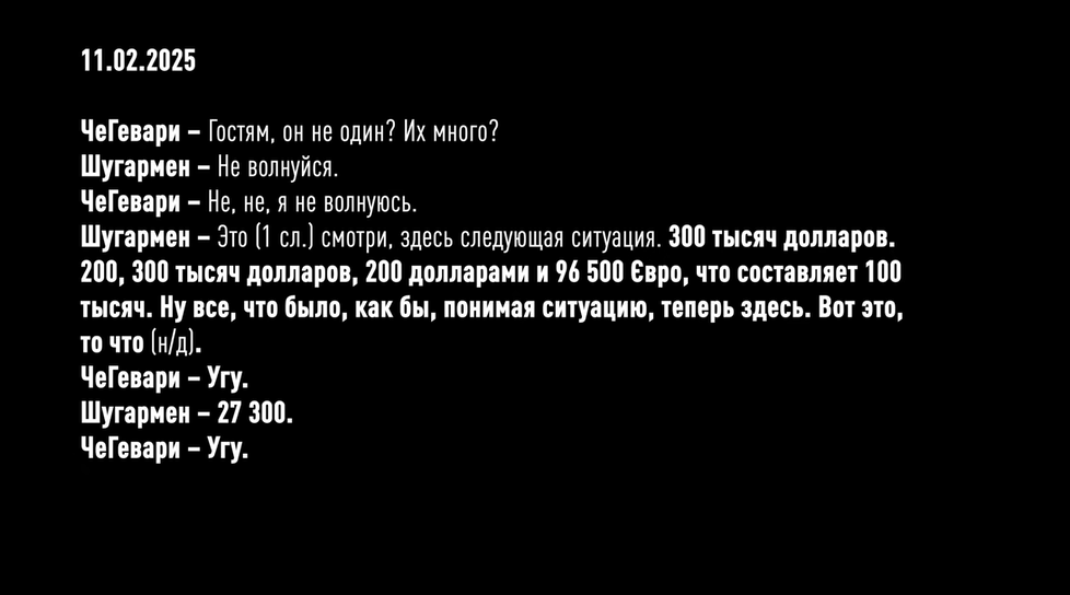 Шугармен: Это... Смотри, здесь следующая ситуация. 300 тысяч долларов. 200, 300 тысяч долларов, 200 долларами и 96500 евро, что составляет 100 тысяч. Ну все, что было, как бы, понимая ситуацию, теперь здесь. Вот это, то что...