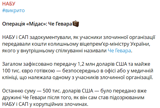 По версии НАБУ, Чернышов, которого во внутреннем общении фигуранты называли Че Гевара, получил от них 1,2 млн долларов и почти 100 тысяч евро наличными в офисе и в медицинской клинике, принадлежавшей одному из участников преступной организации.