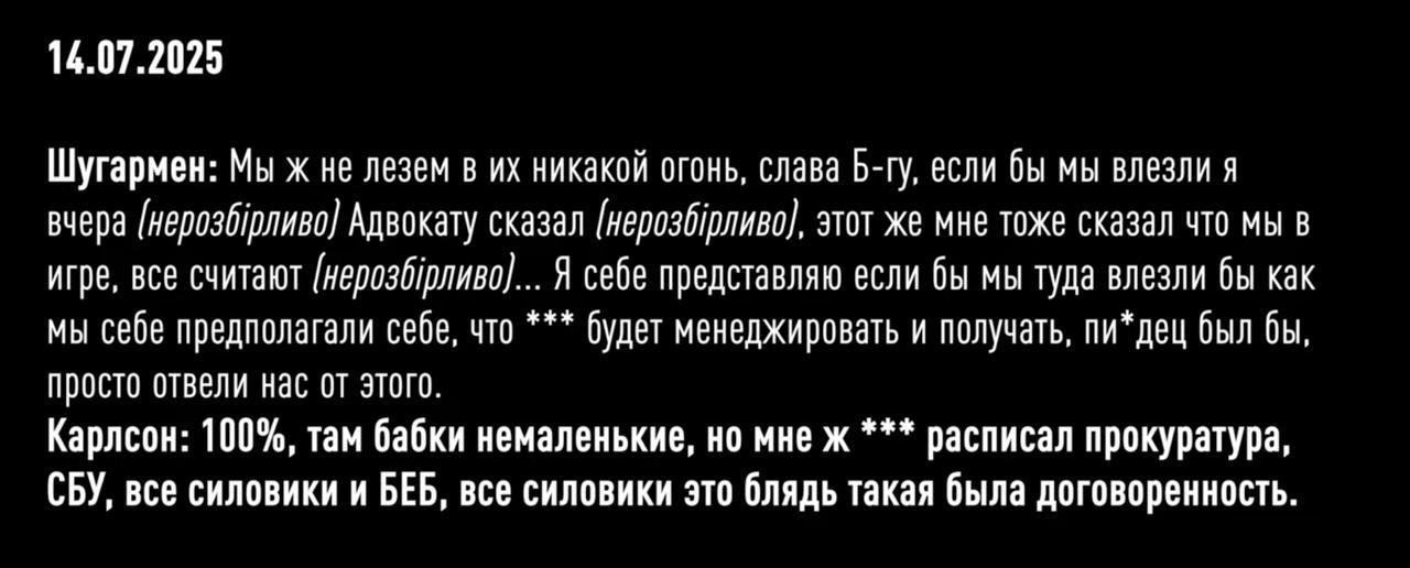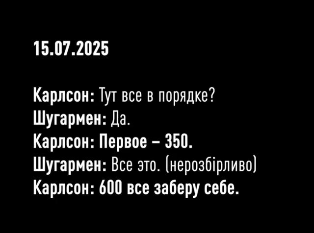 Еще на пленках Карлсон обсуждает с Шугарменом (предположительно, одним из братьев Цукерманов) необходимость поделить "немаленькие бабки" на "прокуратуру, СБУ, всех силовиков и БЭБ". Такую схему ему расписал некто, чье имя не раскрывается.