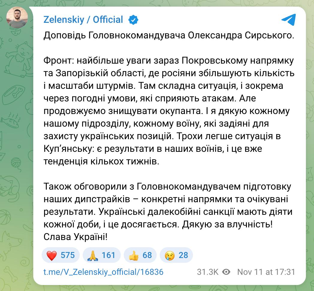 • в Покровске и Запорожской области "сложная ситуация", в частности, из-за погодных условий, которые способствуют атакам россиян (судя по видео с фронта, там сейчас сильный туман, что препятствует ударам дронов - Ред.) Россияне увеличивают количество и масштабы штурмов;