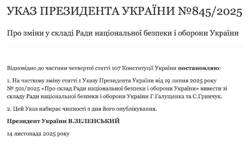 "В соответствии с частью четвертой статьи 107 Конституции Украины постановляю: в рамках частичного изменения статьи 1 указа президента Украины от 19 июля 2025 г. № 501/2025 "О составе Совета национальной безопасности и обороны Украины" вывести из состава Совета национальной безопасности и обороны Украины Г.Галущенко и С.Гринчук", - сказано в докеументе.