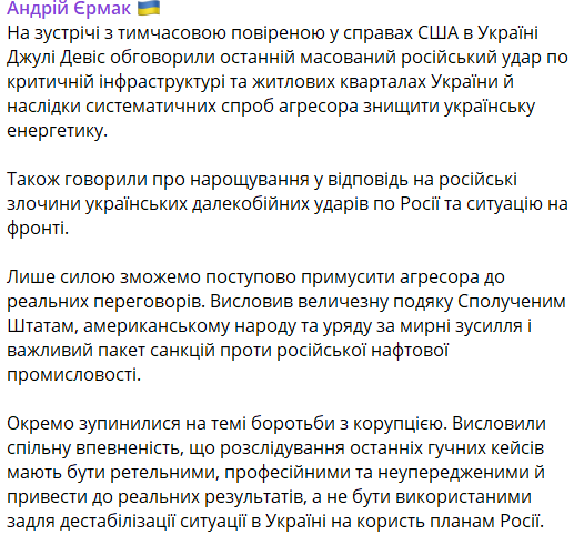 "Отдельно остановились на теме борьбы с коррупцией. Высказывали общую уверенность, что расследование последних громких кейсов должны быть тщательными, профессиональными и беспристрастными и привести к реальным результатам, а не использоваться для дестабилизации ситуации в Украине в пользу планов России", - пишет Ермак.