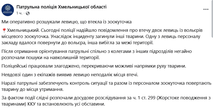 Львицу нашли полицейские. Фото: facebook.com/khmelpolice
