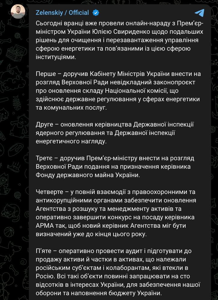 Об этом президент написал в своём телеграм-канале по итогам онлайн-совещания с премьер-министром Украины Юлией Свириденко.