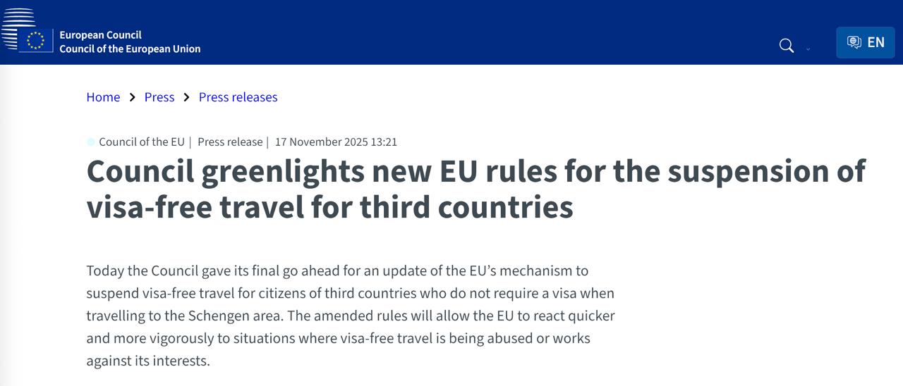 Совет Европейского союза окончательно утвердил новые правила по приостановке безвиза для третьих стран.