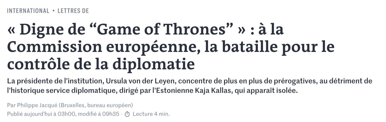 Газета сообщает о "почти навязчивом стремлении руководства Еврокомиссии сосредоточить всю власть в своих руках и не допустить появления любого конкурирующего, даже мало-мальски автономного субъекта". Брюссель дублирует все службы, уже существующие в Европейской службе внешних связей, поскольку последняя "становится всё более неэффективной".