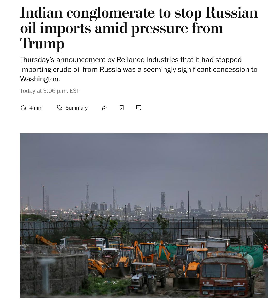 По его словам, отказ одного из ключевых энергетических игроков Индии от импорта российской нефти станет важным сигналом для Вашингтона. Кугельман добавил, что в краткосрочной перспективе Reliance может увеличить закупки нефти на Ближнем Востоке и в США.