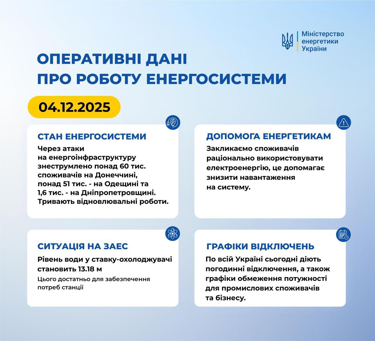 10:42 Из-за атак на энергетическую инфраструктуру обесточено более 112 тысяч потребителей в Донецкой, Одесской и Днепропетровской областях, сообщает Минэнерго.