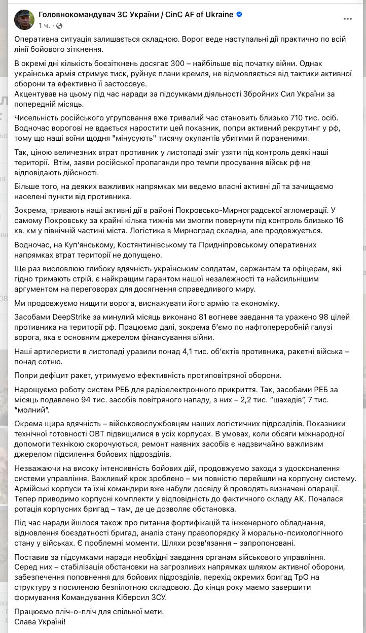 "В отдельные дни количество боеприкосновений достигает 300 – больше всего с начала войны", - заявил Сырский. Он также признал, что "ценой огромных потерь противник в ноябре смог взять под контроль некоторые наши территории". При этом он отрицает высокие темпы продвижения россиян.