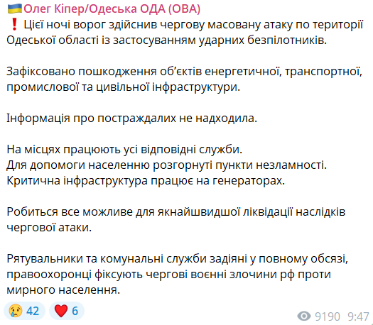 Об этом сообщает глава Одесской областной государственной администрации Олег Кипер в своем телеграм-канале.