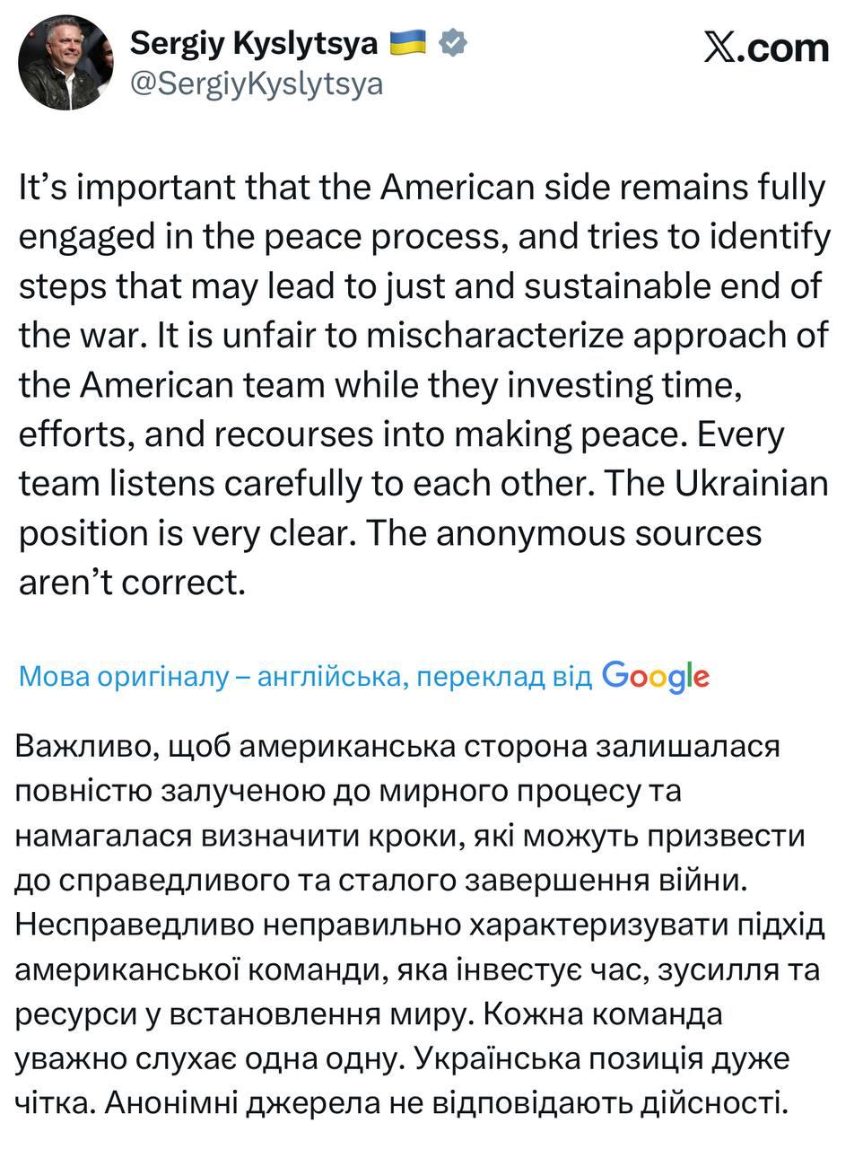 "Находясь в одной переговорной комнате с Кушнером и Уиткоффом второй день подряд, я бы сказал, что распространяемые в СМИ теории заговора ложны. Я положительно впечатлен уровнем понимания интересов Украины и позиции американских партнеров. Важно, чтобы американская сторона оставалась полностью вовлеченной в мирный процесс и пыталась определить шаги, которые могут привести к справедливому и устойчивому прекращению войны. Несправедливо искажать подход американской команды, в то время как они вкладывают время, усилия и ресурсы в установление мира. Каждая команда внимательно слушает друг друга. Позиция Украины очень ясна. Анонимные источники неверны", - заявил Кислица.