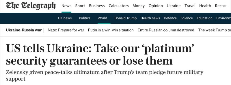 The Telegraph также пишет, что США предъявили Владимиру Зеленскому ультиматум: мол, принимайте наши гарантии безопасности, иначе вы их потеряете. Американцы считают предложенные гарантии по типу 5-й статьи НАТО "платиновым стандартом". Источники в США заявили, что это предложение стало "крупнейшей победой для Украины и для Европы на сегодняшний день" в мирных переговорах.