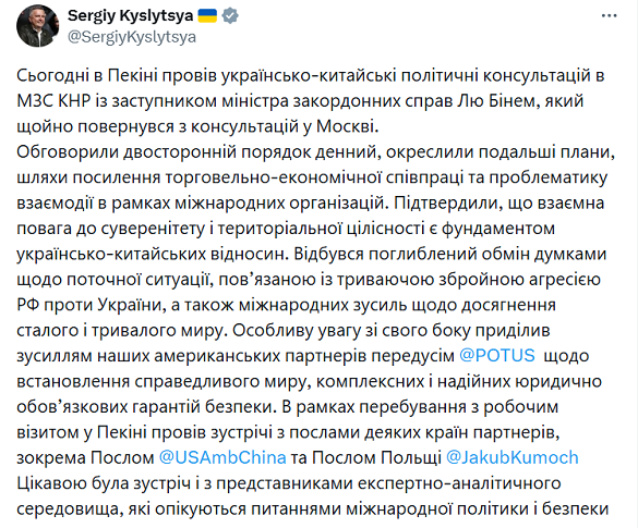 Заместитель главы МИД Украины Сергей Кислица прилетел в Китай, где встретился с послом США Дэвидом Пердью и заместителем министра иностранных дел КНР Лю Бинем.