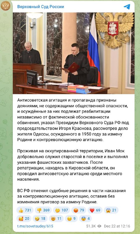 "Антисоветская агитация и пропаганда признаны деяниями, не содержащими общественной опасности, и осуждённые за них подлежат реабилитации независимо от фактической обоснованности обвинения, указал президиум Верховного суда РФ под председательством Игоря Краснова, рассмотрев дело жителя Одессы, осужденного в 1950 году за измену Родине и контрреволюционную агитацию", - сказано в публикации.