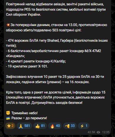 По информации, сбито 474 из 519 БПЛА, 6 из 10 "Кинжалов", 4 из 7 "Искандеров\Калибров", 19 из 21 ракет Х-101, а так же 2 ракеты Х-22.
