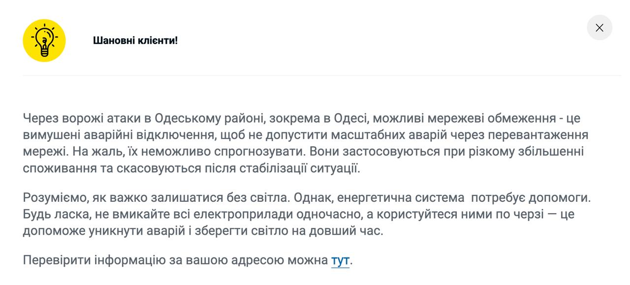 8.21 В Одессе сохраняются аварийные отключения света, ситуацию невозможно прогнозировать, сообщает ДТЭК.