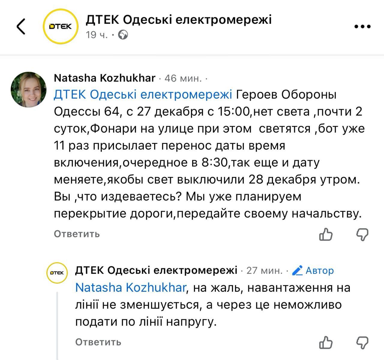 Жители города на сайте компании жалуются на отсутствие конкретных сроков восстановления света. И возмущаются, что ДТЭК требует при этом своевременной оплаты электричества.