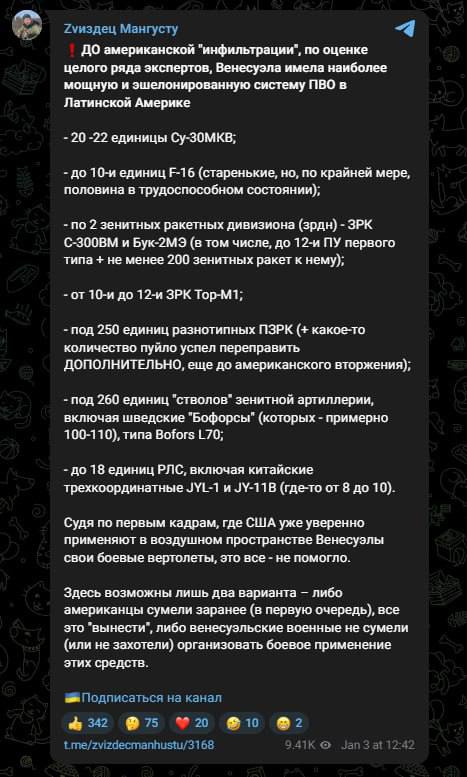 14:25 США провели атаку по Венесуэле несмотря на то, что эта страна имела самую мощную систему ПВО в Латинской Америке, пишет украинский военный эксперт Константин Машовец, не исключая, что имел место "договорняк".