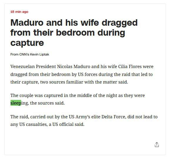 Между тем телеканал CNN со ссылкой на источники подтверждает, что спецназ США из отряда "Дельта" захватили Мадуро с супругой, пока они спали в своей резиденции. Заявляется, что операция прошла без жертв со стороны американских военных.