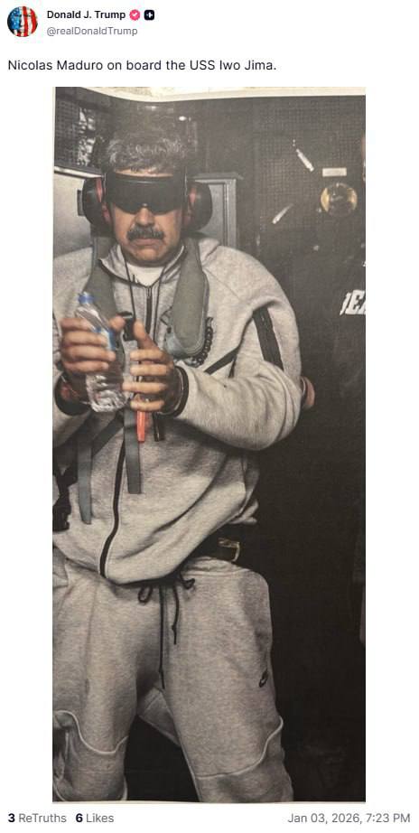 Кроме того, в своей соцсети Truth Social президент США опубликовал фото похищенного Мадуро.