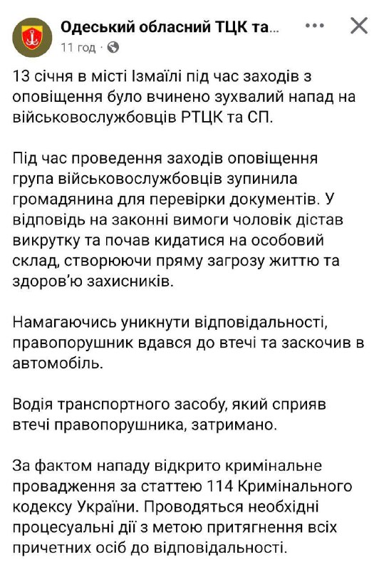 09:58 В Измаиле при проверке документов мужчина угрожал сотрудникам ТЦК отверткой, после чего запрыгнул в проезжающий мимо автомобиль и скрылся, сообщает одесский военкомат.