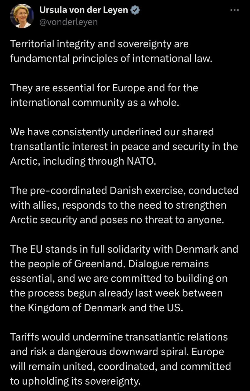 "Заранее скоординированные датские учения, проведенные совместно с союзниками, отвечают необходимости укрепления безопасности в Арктике и не представляют угрозы ни для кого. ЕС выражает полную солидарность с Данией и народом Гренландии", - написала глава Еврокомиссии.