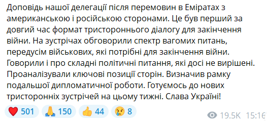 По его словам, украинская делегация уже вернулась в Киев после переговоров в Абу-Даби и доложила об их итогах.