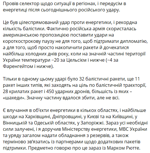 "Фактически российская армия воспользовалась американским предложением поставить удары на краткосрочную паузу не для того, чтобы поддержать дипломатию, а для того, чтобы просто накопить ракеты и дождаться наиболее холодных дней года, когда на значительной части территории Украины температуры -20 по Цельсию и ниже", - написал президент.