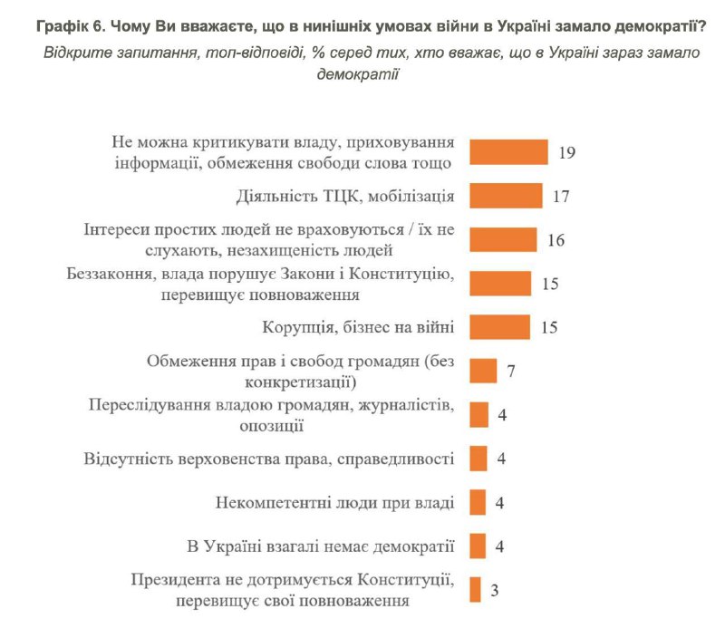 Среди основных признаков нехватки демократии украинцы называют запрет критики власти, сокрытие информации и ограничение свободы слова (19%), деятельность ТЦК и мобилизацию (17%), игнорирование интересов простых людей, которых не слушают, незащищенность людей (16%), беззаконие, нарушение властью законов и Конституции, превышение полномочий (15%), коррупцию, бизнес на войне (15%), ограничение прав и свобод граждан (7%), преследование журналистов и оппозиции (4%), отсутствие справедливости и верховенства права (4%).