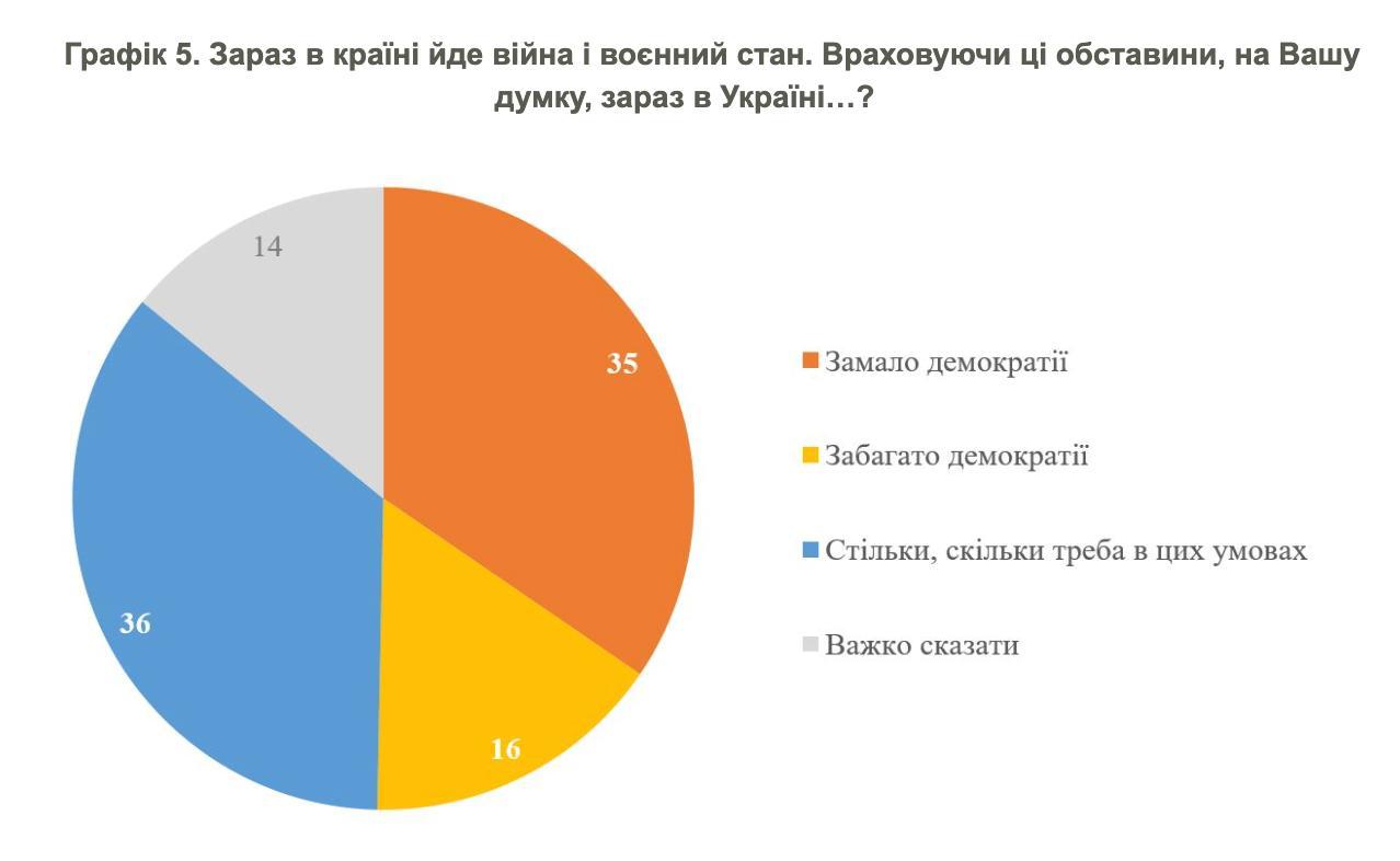 35% опрошенных считают, что в Украине не хватает демократии, 36% - что её столько, сколько нужно в условиях войны, а 16% - что даже многовато. 14% не определились с выбором ответа.