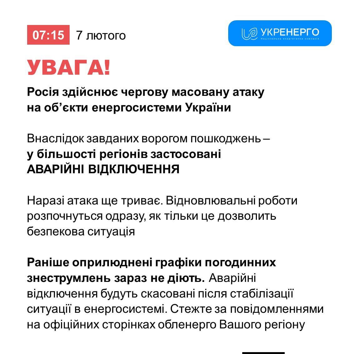 7:47 Из-за ударов по энергосистеме в большинстве регионов Украины вводятся аварийные отключения света. Об этом сообщает "Укрэнерго".