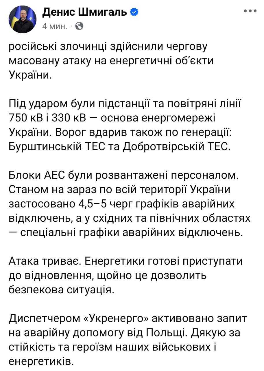 8:48 Целью сегодняшнего удара стали подстанции и воздушные линии электропередачи напряжением 750 и 330 кВ — основа энергосистемы Украины.