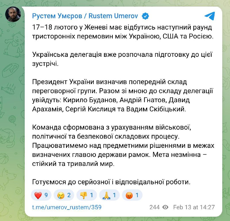 Следующий раунд переговоров делегаций Украины, США и России состоятся в Женеве 17-18 февраля. Причем московскую делегацию снова возглавит помощник президента России Владимир Мединский.