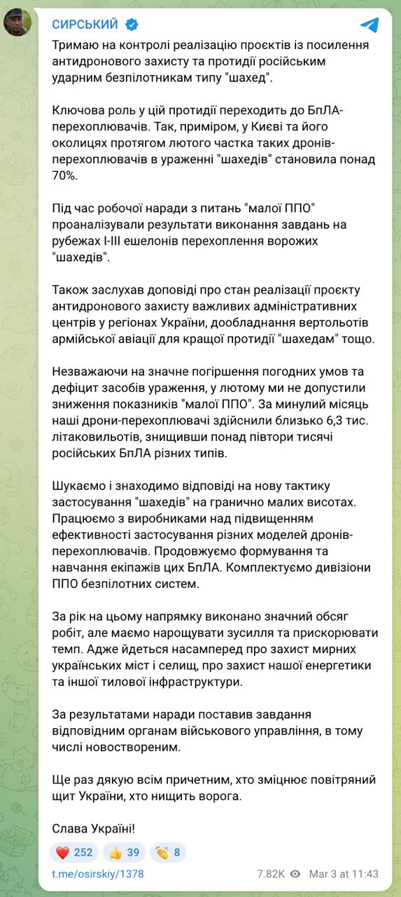 "Ищем и находим ответы на новую тактику применения "Шахедов" на предельно малых высотах. Работаем с производителями над повышением эффективности применения различных моделей дронов-перехватчиков. Продолжаем формирование и обучение экипажей этих БпЛА. Комплектуем дивизионы ПВО беспилотных систем", - написал главком.