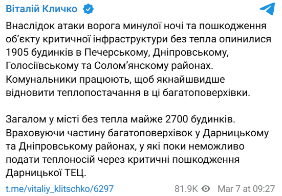 В результате атаки РФ на столицу прошлой ночью и повреждения объекта критической инфраструктуры без тепла остались 1905 домов.