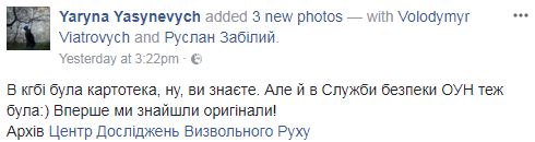 По ее словам, оригиналы этих документов обнаружены впервые. "В КГБ была картотека, ну, вы знаете. Но и у Службы безопасности ОУН тоже была. Впервые мы нашли оригиналы!", - написала Ясиневич.
