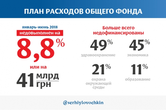 План расходов общего фонда за первое полугодие 2018 года недовыполнен на 8,8% или на 41 млрд гривен. То есть реальный дефицит бюджета по общему фонду – не 13 млрд, а 54 млрд гривен. Это означает, что почти каждая десятая гривна, запланированная на те или иные расходы, до получателей не дошла.