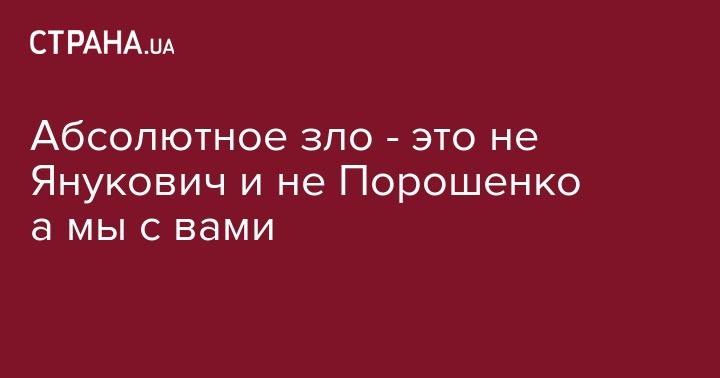 Одни в ленте пишут, что Янукович это абсолютное зло. Другие, что на фоне Януковича абсолютное зло - Порошенко. На самом же деле ни один, ни другой никакое не зло - ничтожества, отличающиеся лишь расцветкой тараканов в голове. А абсолютное зло это мы - народ, который сам, добровольно выбирает себе таких лидеров.