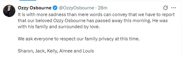 "С грустью, которую невозможно выразить словами, мы вынуждены сообщить, что сегодня утром ушел из жизни наш любимый Оззи Осборн. Он был со своей семьей и окружен любовью", — говорится в заявлении семьи.