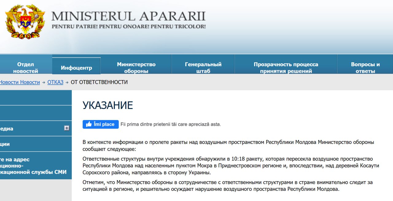 Міноборони Молдови підтвердило, що повітряний простір країни перетнула ракета, яка прямує у бік України. Судячи із заяви Кишинева, ракета пройшла над Придністров'ям.
