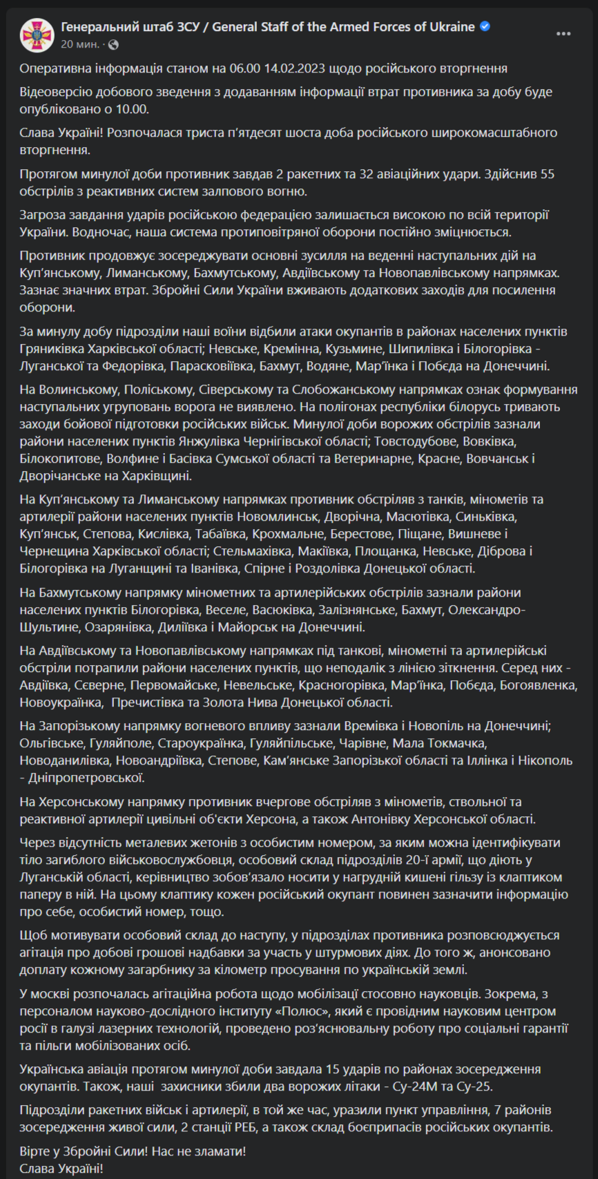 Вранці у вівторок, 14 лютого, Генштаб ЗСУ опублікував актуальне зведення про те, що зараз відбувається на фронті. Росіяни продовжують наступ на п'яти напрямках і зазнають великих втрат, пише Генштаб.