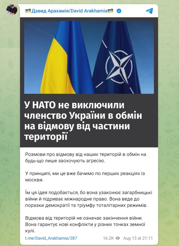 Лідер парламентських "слуг народу" Давид Арахамія прокоментував пропозицію глави канцелярії генсека НАТО Стіана Йєнсена обміняти членство України в НАТО на територіальні поступки на користь Росії.