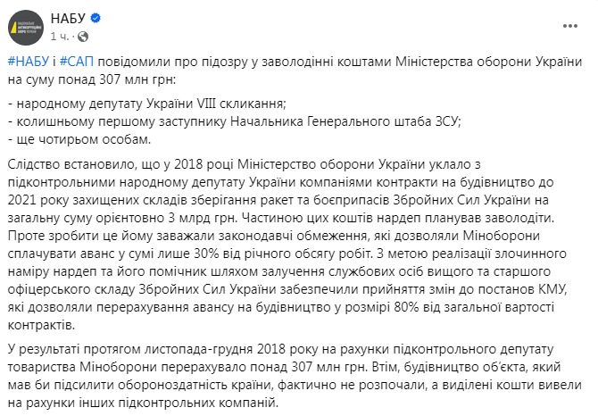 Національне антикорупційне бюро України (НАБУ) повідомило про підозру екс-нардепу та колишньому першому заступнику голови Генштабу у справі про розкрадання 307 мільйонів гривень під час будівництва складів для зберігання ракет та боєприпасів ЗСУ.
