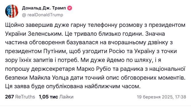 "Президент Трамп поділився подробицями своєї розмови з Путіним і розповів про обговорювані ключові питання. Одним із перших кроків до повного припинення війни може стати припинення ударів по енергетичній та іншій цивільній інфраструктурі. Я підтримав цей крок, і Україна підтвердила, що ми готові його здійснити", - заявив Зеленський.